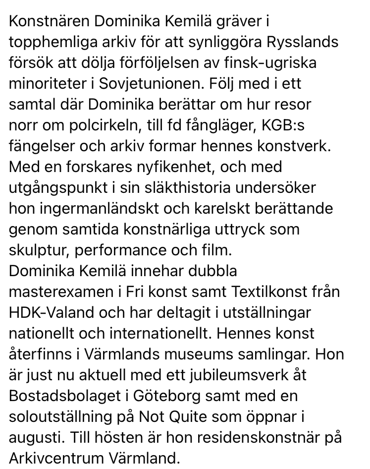 ”Dominika Kemiläs ”Brevet” visas på Oceanhallen plan 2 och är en utställning om ”minnets plats i samhället och rösten som motkraft”. Med ljud, video, performance och måleri tar upp Dominika Kemilä nutida ingermanländska och karelska berättartraditioner